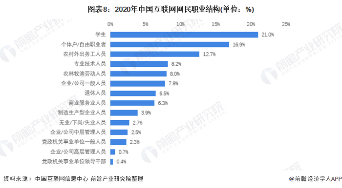 截至2020年12月,在我国网民群体中,学生最多,占比为21.0%;其次是个体户/自由职业者,占比为16.9%;农林牧渔劳动人员占比为8.0%。