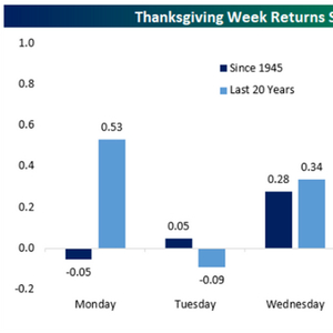 1945年以来,感恩节当周平均上涨60个基点,最好的回报出现在感恩节的前一天(星期三)。另外,星期五的行情走势也不赖。