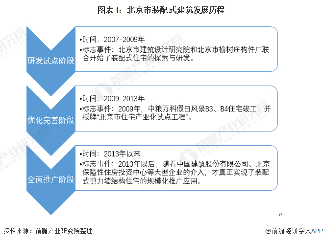 从北京市装配式建筑发展历程来看,大体经历了研发试点阶段(2007-2009年);优化完善阶段(2009-2013年);体系成熟、全国推广阶段(2013-至今)三个阶段。