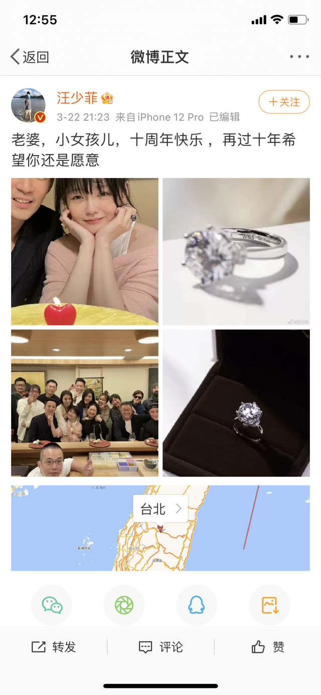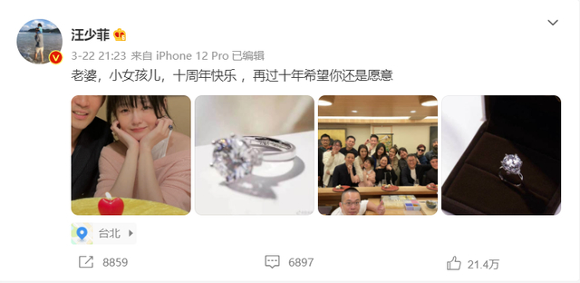 在汪小菲的微博中,还能看到他在3月22日发布的、与大S、好友林心如、霍建华等人一起庆祝结婚十周年的微博。他晒出了自己购买的钻戒,并且发布了“十周年快乐,再过十年希望你还是愿意”的文字。微博定位在中国台湾省台北市。