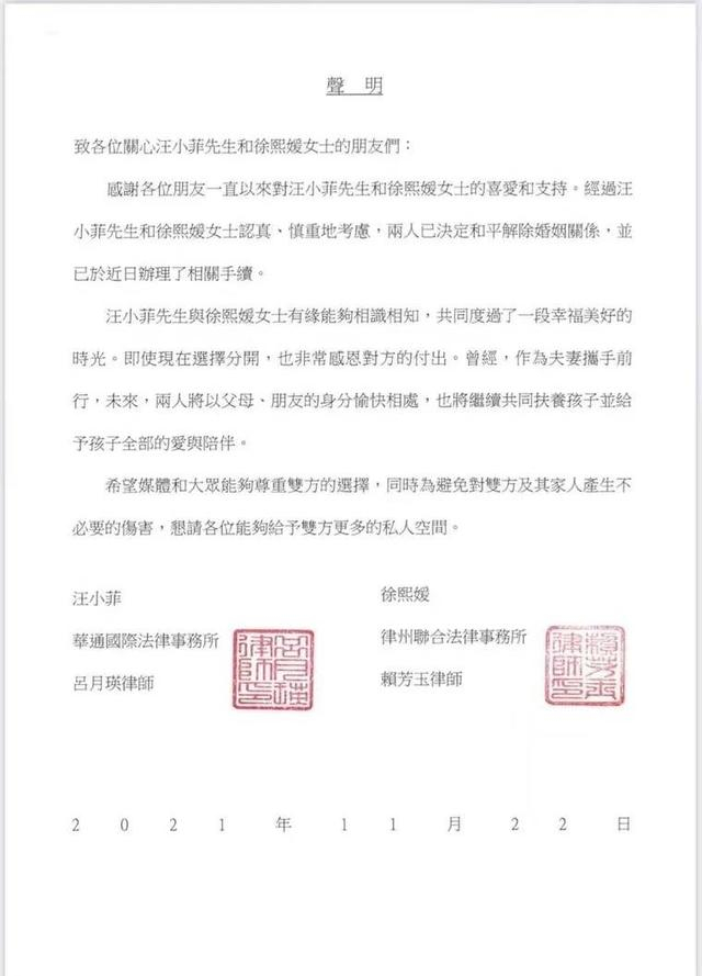 11月22日,汪小菲和徐熙媛(大S)通过媒体发表律师声明称,“经过汪小菲先生和徐熙媛女士认真、慎重地考虑,两人已决定和平解除婚姻关係,并已于近日办理了相关手续。”两人将针对双方名下约人民币2亿元进行分割,包括了大S名下的豪宅,和汪小菲名下、以大S名字命名的“S hotel”酒店及其他财产。
