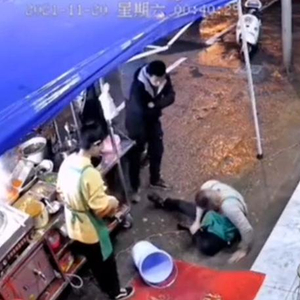 11月20日凌晨,广西柳州一家螺蛳粉店老板抱着水桶重重摔在地上的画面被监控拍下。摔倒后,老板脚出现骨折,挣扎了几秒无法起身,被边上人扶起。