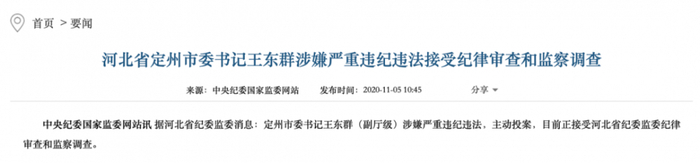 高宏志主动投案两个月之后,2020年11月5日,时任定州市委书记王东群(副厅级)涉嫌严重违纪违法,主动投案。