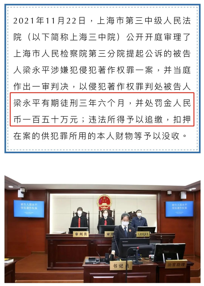 据上海市第三中级人民法院官方微信显示,11月22日,上海市第三中级人民法院公开开庭审理了被告人梁永平涉嫌侵犯著作权罪一案,并当庭作出一审判决,以侵犯著作权罪判处被告人梁永平有期徒刑三年六个月,并处罚金150万元;违法所得予以追缴,扣押在案的供犯罪所用的本人财物等予以没收。