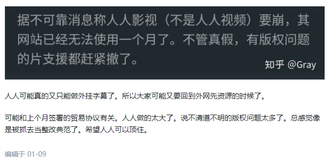 在一审判决对外公布后,“人人影视字幕组”官方微博也发文明确了“人人影视不可能再恢复或重启”,并表示,“App的尸体可以删了,我们不可能解决得了版权问题……”。