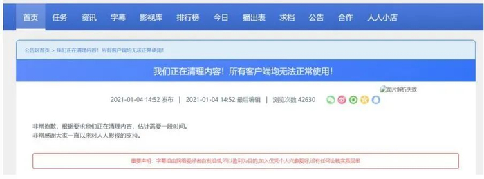 1月4日“人人影视”在官网发布《我们正在清理内容!所有客户端均无法正常使用!》的公告