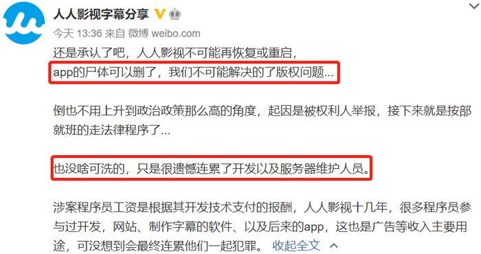“还是承认了吧,人人影视不可能再恢复或重启”,@人人影视字幕分享 官方在微博上写到。