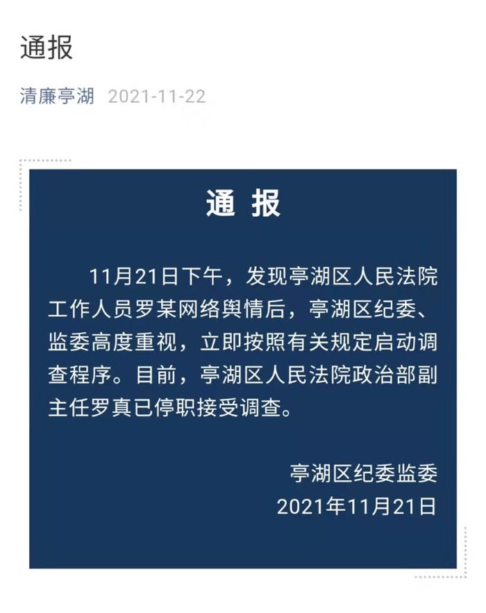 21日,一名女子在微博发文举报称,自己遭到江苏盐城市亭湖区人民法院工作人员罗某骚扰,同时附上其与罗某在KTV的暧昧照片,以及两人的部分微信聊天记录截图。22日凌晨,亭湖区纪委监委发布通报称,目前,亭湖区人民法院政治部副主任罗某已停职接受调查。