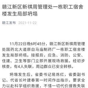江西一栋职工宿舍楼发生局部坍塌,4人死亡