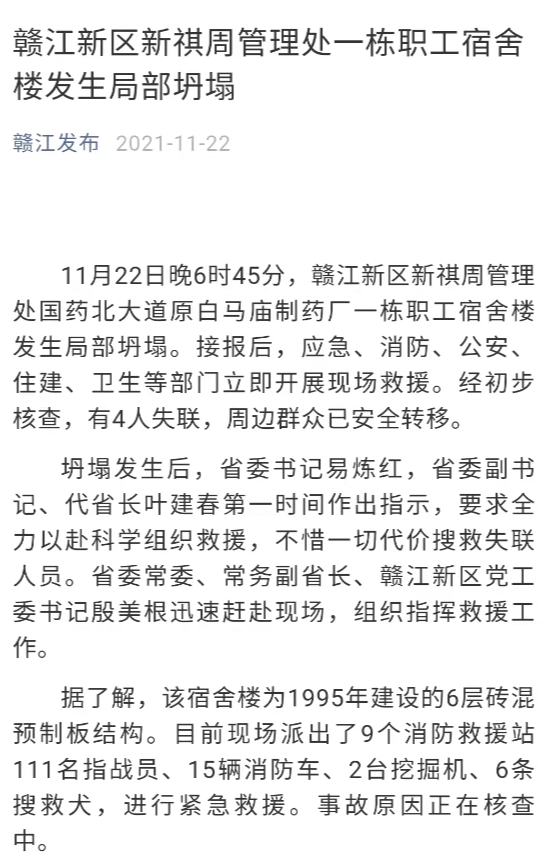 据“赣江发布”22日消息,11月22日晚6时45分,江西赣江新区新祺周管理处国药北大道原白马庙制药厂一栋职工宿舍楼发生局部坍塌。接报后,应急、消防、公安、住建、卫生等部门立即开展现场救援。经初步核查,有4人失联,周边群众已安全转移。