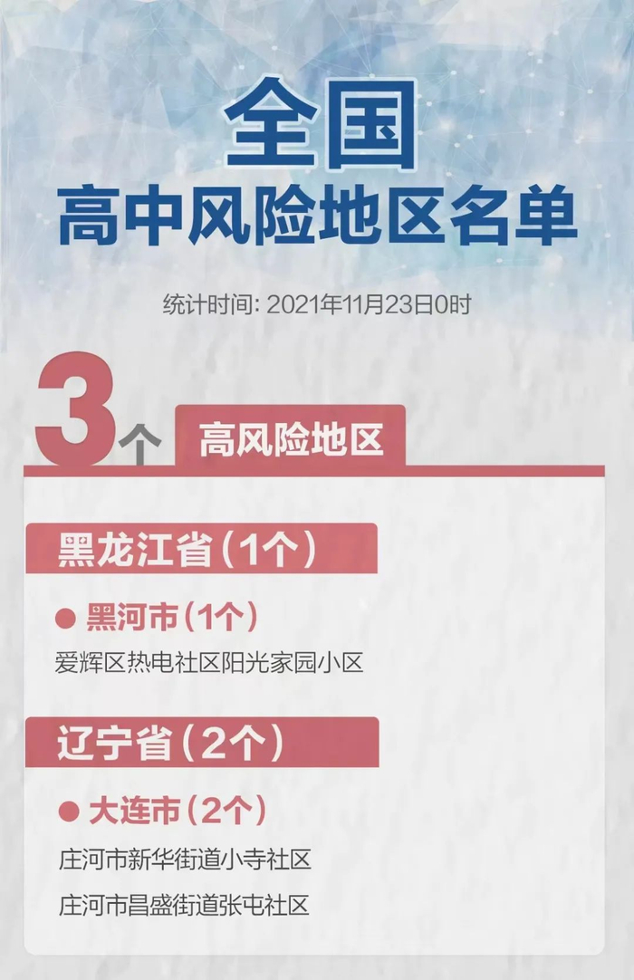 截至发稿,全国共有3个高风险区,25个中风险区。