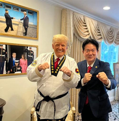 据韩国东亚日报11月22日消息,韩国国技院院长李东燮(音)20日访问了美国前总统特朗普的别墅——美国佛罗里达棕榈滩海湖庄园,并向特朗普赠送了跆拳道荣誉黑带九段证和跆拳道服。李东燮表示,“据我所知,特朗普前总统平时对跆拳道有着特别的感情”,“希望今后多多关注跆拳道和国技院,并给予合作。”据悉,李东燮的此次访问是在当地韩国侨胞的安排下进行的。