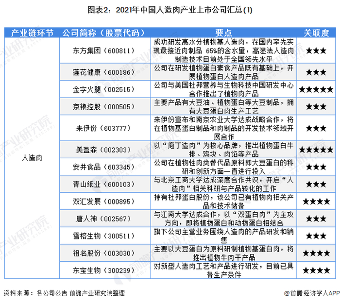 目前,我国人造肉行业正处在发展初期,相关企业正在进入技术积累和产品研发当中,相关上市公司的人造肉业务并未形成营收规模,大部分都处在市场拓荒阶段。在我国人造肉产业上市公司中,有双塔食品、山东赫达、华宝股份的上游原材料企业,人造肉企业包括东方集团、金字火腿等。