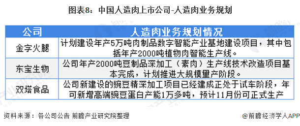 由于人造肉行业起步较晚,行业发展处于早期阶段,相关企业依然处于业务摸索阶段,仅为部分相关企业在业务上有一定的长远布局。金字火腿在最新的数字智能产业基地中规划了2000吨的植物肉智能生产线,东宝生物正计划推进人造肉大规模量产,双塔食品也在上游原材料布局逐步加深。