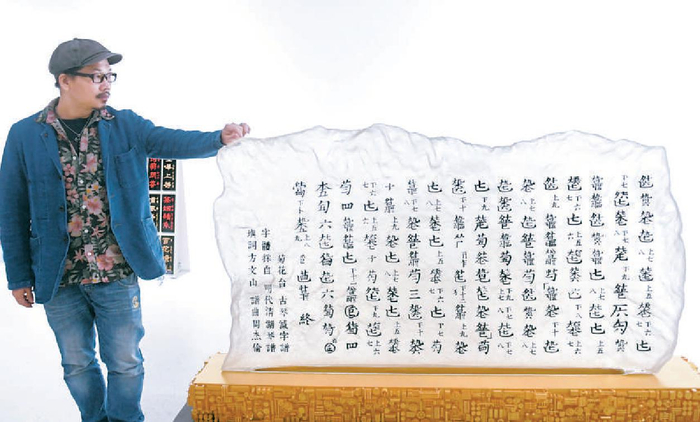 看得出来,方文山对此次巡回展极为重视,即便往返皆需隔离21天,他还是特意从台湾赶到北京亲自筹备布展,一遍遍向媒体阐释他的创作理念。《东风破》《菊花台》《千里之外》……这些曾风靡乐坛的歌词,在展厅中以青铜器、陶瓷、珐琅文字、印刷木雕、装置艺术、雕塑、版画、纸上作品等形式呈现,如同凝固了时光,又承载起新的意义。他坦言:“这些歌词确实成为了某个年龄层的共同记忆。在很多年之后,当大家进入职场、步入中年,只要曾经喜欢的音乐片段一响起来,就能回到青春,这就是流行音乐的魅力。”
