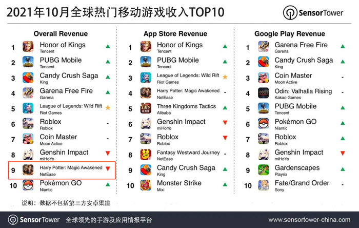 不过,Sensor Tower的数据显示,10月全球热门移动游戏收入排行中,腾讯旗下《王者荣耀》《PUBG Mobile》收入依然霸榜前二,另外《英雄联盟手游》也挤进前五,但《哈利波特:魔法觉醒》收入已掉队至第九,网易第四季度的增长还需要更多发力。