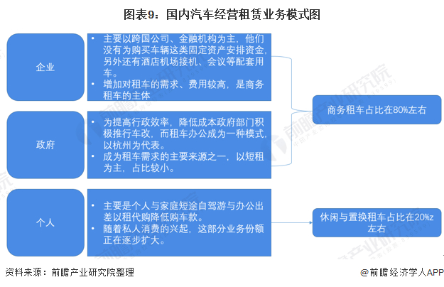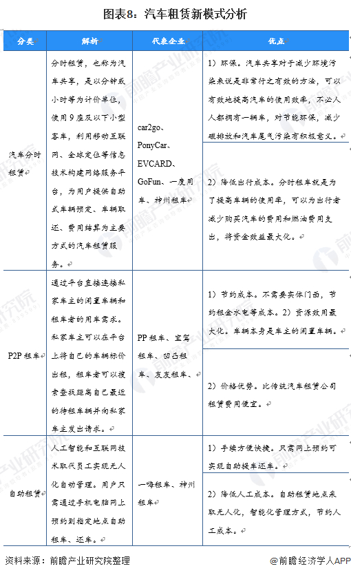 目前,中国汽车经营租赁模式大致可以分为分时租赁、P2P租车和长短租三种模式,经营租赁的参与方包括了互联网创业平台、车企运营商和租车公司。
