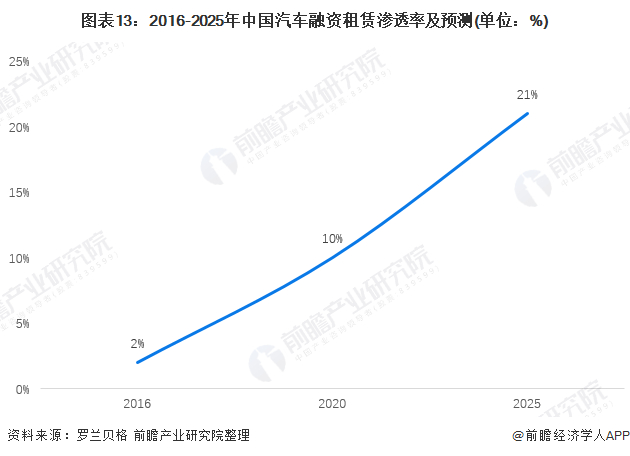 根据罗兰贝格发布的《2020中国汽车金融报告》,我国汽车融资租赁在这3年的发展速度相当之快。在2016年时我国汽车融资租赁的渗透率仅为2%,2020年已发展至10%,而这一数字预计在2025年时将达到21%左右。届时,汽车融资租赁对汽车金融渗透率的贡献将达到34%。