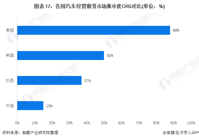 中国汽车租赁市场相对来说较为分散,并未有明确的龙头企业形成垄断或规模经济,领先的企业包括神州、一嗨等公司。就长租市场而言,前5大汽车租赁公司也仅占市场总规模的15%左右,而在租车业比较发达的美国市场,这一份额高达88%;在韩国与巴西,相应份额分别为50%和37%,也远高于国内市场。