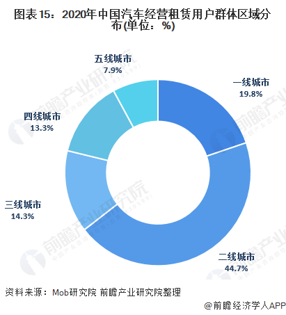 近年来新一线城市及二线城市经济快速发展,由于人口基数较大,已成为汽车经营租赁聚集地,2020年,二线城市经营租赁用户群体占44.7%。
