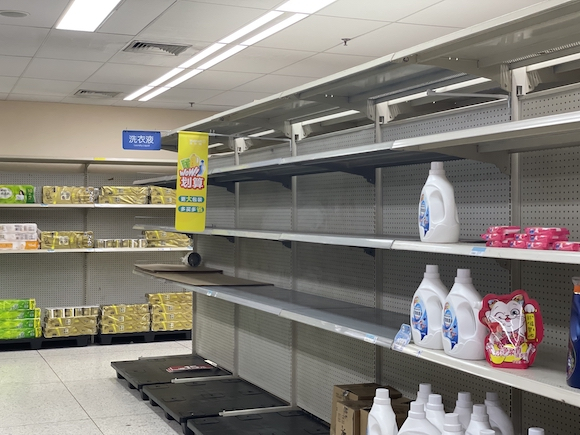 为配合结业,洪湖沃尔玛场内大量产品用白色A4字标注了促销信息;位于三楼的眼镜店、内衣店均已挂出撤场甩卖的横幅标语,不少货架上已经没有货品。商场撤离后,这里的大部分商品将重新分配给沃尔玛其他门店进行销售。