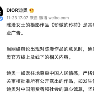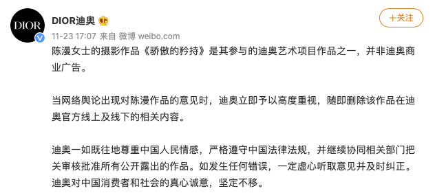 11月23日晚间,@DIOR迪奥 发布声明称,陈漫女士的摄影作品《骄傲的矜持》是其参与的迪奥艺术项目作品之一,并非迪奥商业广告。当网络舆论出现对陈漫作品的意见时,迪奥立即予以高度重视,随即删除该作品在迪奥官方线上及线下的相关内容。