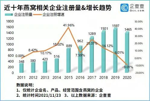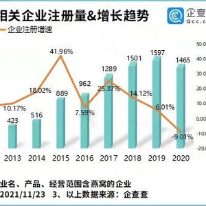2013年之后,经过对行业的整顿、规范,燕窝市场重新进入快速发展阶段。企查查数据显示,与燕窝相关企业的注册量从2013年的423家增加至2019年的1597家,累计增长率逾277%,2020年,燕窝企业注册量为1465家,同比下降9.01%。