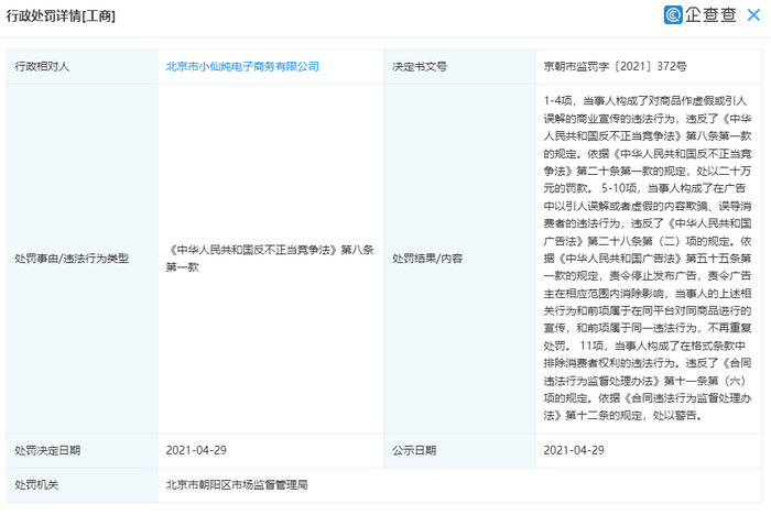 4月29日,根据京朝市监罚字〔2021〕372号,北京小仙炖生物科技有限公司构成了对商品作虚假或引人误解的商业宣传的违法行为;构成了在广告中以引人误解或者虚假的内容欺骗、误导消费者的违法行为;构成了在格式条款中排除消费者权利的违法行为。