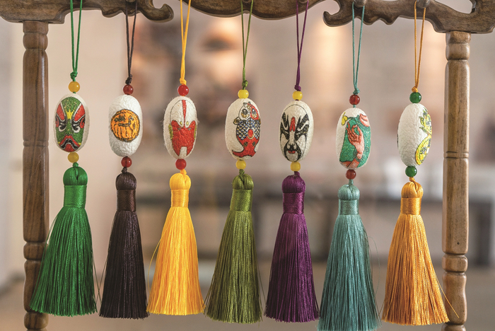 在“江南茧画艺术博览院”制作茧画,这样有特色的文化体验也是非常值得参与的。照旧两人一组以蚕茧为画布,辅之以现代技术,在适宜的温度和湿度下烘干处理,再通过染、固化、绘、艺术组合成为茧画。大家可以在老师的指导下,体验茧画的“设计-绘-烘-串”四个流程。当把烘干的茧画串起来后,“福”字、荷花、四叶草、小动物等等各种不可思议的形象跃然纸上,便能切身领悟到所谓“方寸之间天地宽,一茧一画尽国风”是怎样一种魅力,这是一种中国文脉的传承与现代创新相结合,展现出非遗的独特魅力。