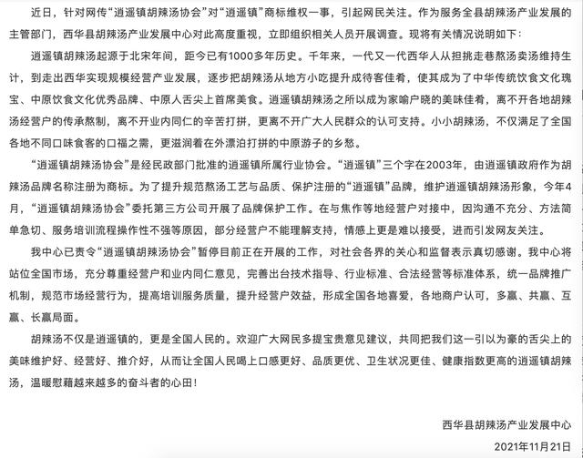 争议之中,11月21日晚,西华县胡辣汤产业发展的主管部门、西华县胡辣汤产业发展中心发布通报,称“已责令‘逍遥镇胡辣汤协会’暂停目前正在开展的工作。”