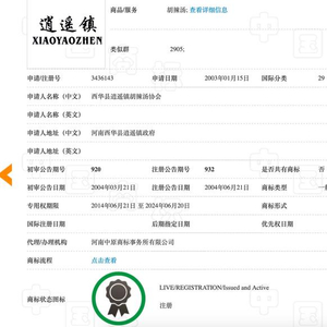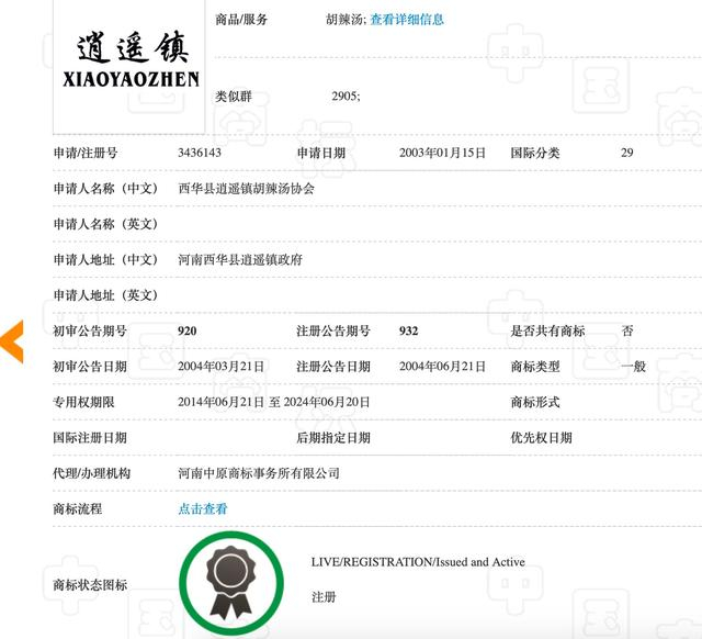 中国商标网显示,“逍遥镇”胡辣汤商标申请于2003年1月15日,注册公告于2004年6月21日。
