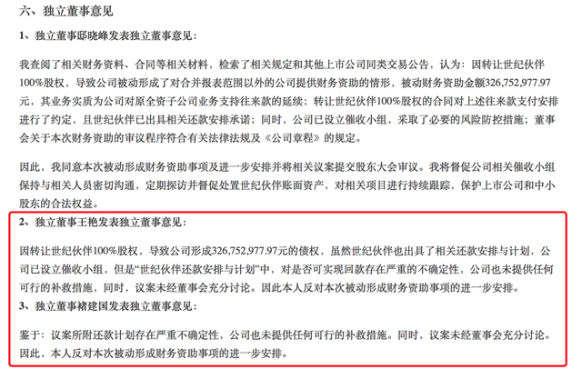 ST北文在8月、9月连续有独立董事对相关审议投出反对票。9月,面对《关于转让子公司股权被动形成财务资助事项及进一步安排》的议案,ST北文两位独立董事褚建国、王艳投出反对票。两位独立董事表示,议案所附的“世纪伙伴还款安排与计划”对是否可实现回款存在严重的不确定性,公司也未提供任何可行的补救措施,同时,议案未经董事会充分讨论。