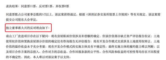 独立董事蒋大兴投出了唯一反对票,反对理由为,南山工厂改造项目存在五方面疑问,包括现有房屋账面价值、土地使用权价值和置换房屋部分价值等缺乏评估报告,土地价值的溢价收益未予充分考量,现有开发合作模式的实施主体具有不确定性、最终实施主体的履约能力难以判断,项目合作方案的总投入、合作对方的总收益、合作回报条款的公平性、合作风险和收益的可控性等均存在不同程度的不确定性。