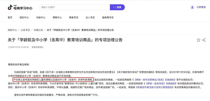 11月19日,抖音向创作者及商家进一步明确,平台禁止发布面向学龄前儿童的课程以及面向中小学(含高中)的学科类课程,违反此规范的商家,一经发现将按照《【商家—发布违禁商品/信息】实施细则》等平台规则处罚。