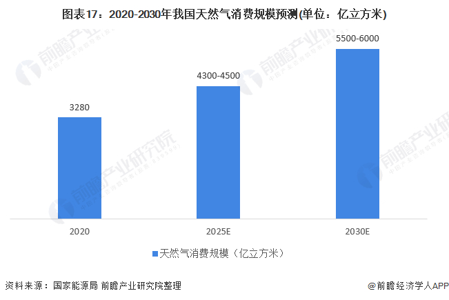 天然气作为最清洁低碳的化石能源,未来为助力碳达峰、碳中和目标的实现。国家将积极推动天然气产业实现高质量发展。通过合理引导和市场建设,国家能源局预计2025年我国天然气消费规模达到4300-4500亿立方米,2030年达到5500-6000亿立方米。