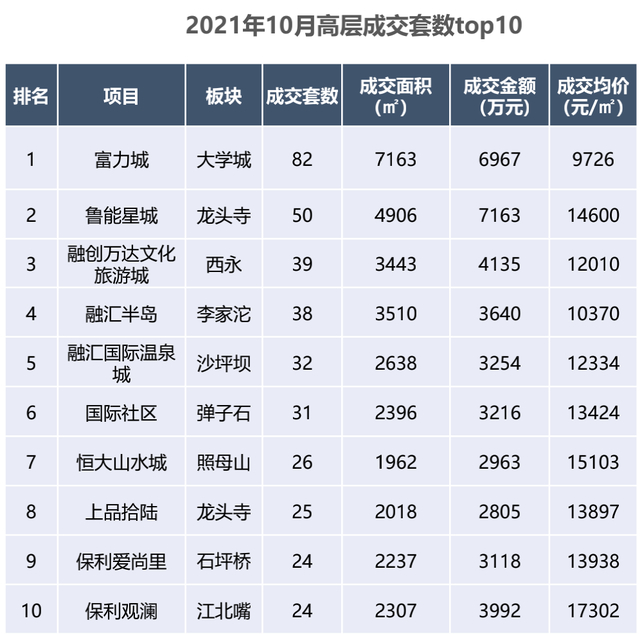其中,大学城板块的富力城卖得最好,10月份成交了82套,成交均价建面9726元/㎡。其次是位于龙头寺的鲁能星城,成交了50套,成交均价建面14600元/㎡。