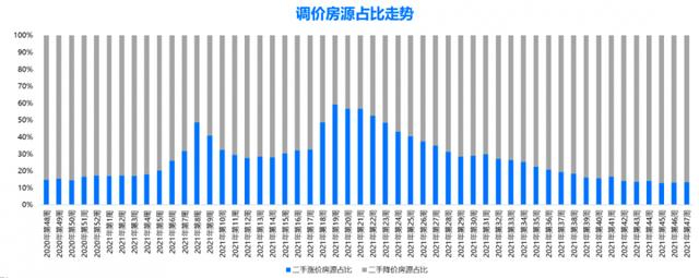 从贝壳研究院统计的调价房源占比来看,业主对于市场预期持续缓解,涨价房源从今年5月份的近60%降到了最近的约13%。