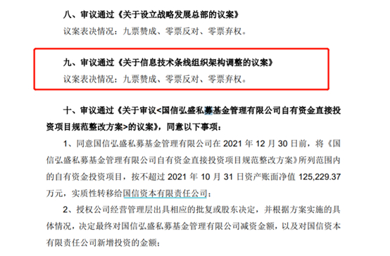 除了上述人事任命,国信证券董事会审议通过的《关于信息技术条线组织架构调整的议案》也值得关注。