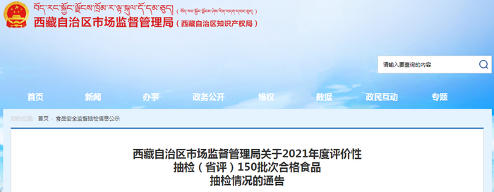 原标题:西藏市场监管局关于2021年度评价性抽检(省评)150批次合格食品抽检情况的通告