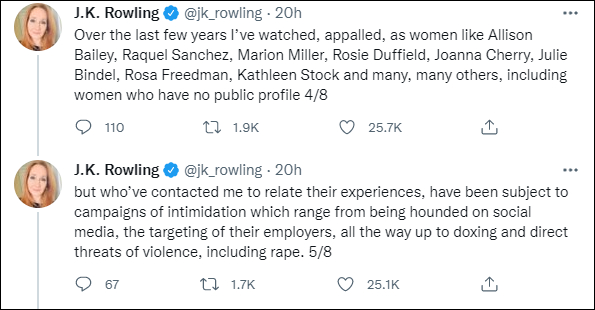 罗琳称,在过去的几年里,她震惊地看到,像艾莉森·贝利(Allison Bailey)、拉奎尔·桑切斯(Raquel Sanchez)、马里恩·米勒(Marion Miller)等女性活动家,以及许多未曾公开露面但联系她,向她讲述个人遭遇的女性,都遭受了各种各样的恐吓——从社交媒体上的骚扰,到针对她们的雇主,再到人肉搜索和包括强奸在内的直接暴力威胁。