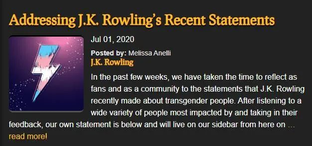 但是,很多网民依旧认为罗琳的这些言论是对跨性别群体的歧视,她还被人贴上“TERF”(排斥跨性别的激进女权主义者)标签。由此,双方展开了一场长达2年的拉锯战,两方对决越来越激烈,颇有种至死方休的意思,罗琳甚至还被《哈利波特》两大粉丝网站“破釜酒吧”(Leaky Cauldron)和“麻瓜网”(Mugglenet)开除了“原著籍”……