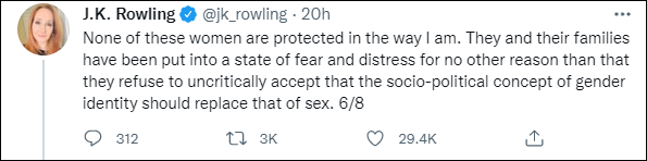 “这些女性没有一个像我一样受到了保护。她们和家人之所以陷入恐惧和痛苦,无非是因为对于‘性别认同的社会政治概念应该取代性别的概念’这一说法,她们拒绝不加批判地接受。”