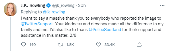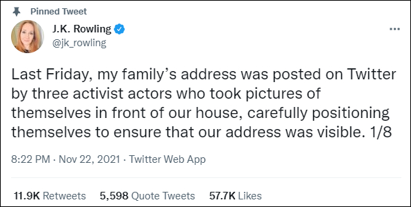 据罗琳表示,11月19日,3名跨性别活动人士在推特上曝光了她的家庭住址。他们还在她家门前“精心”摆拍,以确保照片能显示出她家的门牌号。在照片传播过程中,有人向推特客服举报这张图片违反推特服务条款,英国苏格兰警方也随之介入,为罗琳提供帮助。“我们知道这起事件,警方正在进行调查,”苏格兰警方发言人在回应时表示。