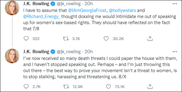 罗琳22日在推特上表示,她的家庭住址遭人拍照曝光,自己也收到了许多死亡威胁。她呼吁人们停止转发相关照片,还连发8条推文,表示自己不会被吓倒,会继续为“女性性别权利”发声。