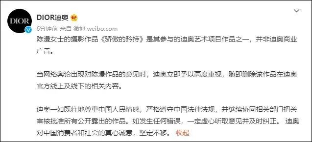 @DIOR迪奥 称,该作品并非商业广告,网络舆论出现后,迪奥立即予以高度重视,随即删除该作品在迪奥官方线上及线下相关内容。