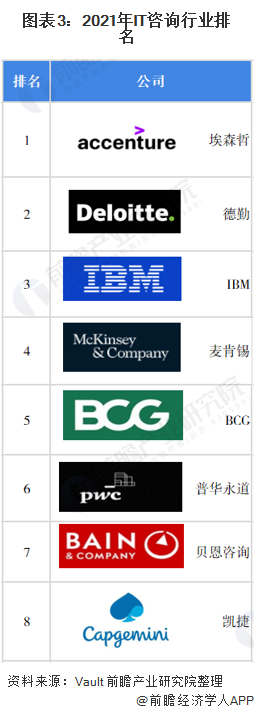 IT咨询业务最起源于国外,于2000年左右,中国出现第一批独立于硬件和软件厂商的、以系统集成和售后维护为核心业务的IT服务商,根据Vault的排名,目前市场中著名的IT咨询公司均为国外企业,其中位列第一的为埃森哲,其次为德勤和IBM。