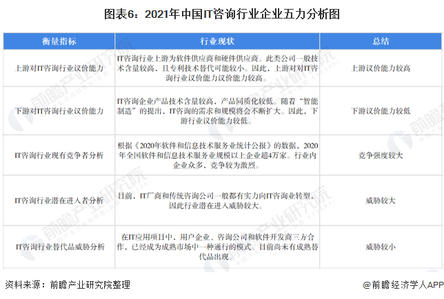 目前,IT咨询行业上游企业技术含量较高,专利技术替代性较小,因此上游对IT咨询行业的议价能力较高;下游企业对IT咨询的需求量有望持续扩大,且IT咨询产品同质化较低,因此下游议价能力较低;目前行业内软件和信息技术服务业规模以上企业超过4万家,行业内竞争强度较大;IT厂商和传统咨询公司企业都有实力向IT咨询行业转型,因此潜在进入者威胁较大;目前尚未有成熟的IT咨询替代品出现,因此IT咨询行业替代品威胁较小。