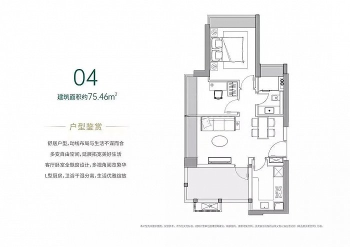 而建面约75.46平方米的户型,设计成两室两厅一卫,配有超大的阳台。