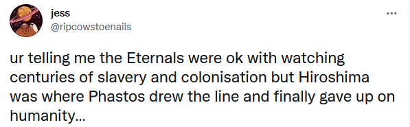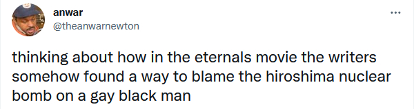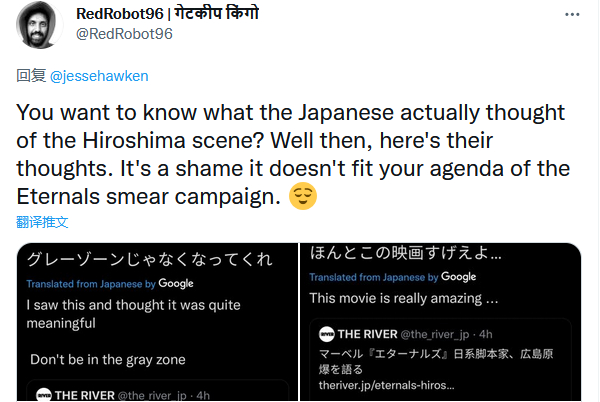 一部分美国网友还关注到马修将向广岛投弹的责任扣在了一个黑人的头上,“你知道有什么比广岛核爆能让法斯托斯(黑人永恒族)更崩溃的吗?让他看到他发明的犁技术最终被用来奴役黑人。”“永恒族看了几个世纪的奴隶制和殖民化,结果广岛核爆让他对人类绝望了……”