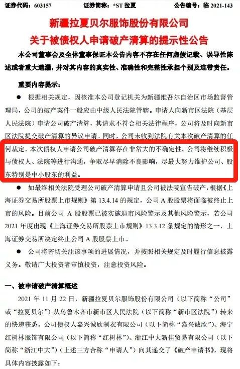 近日,*ST拉夏于11月23日发布公告称,公司被债权人申请破产清算,公司A股股票将面临被终止上市的风险。